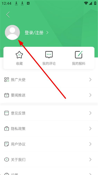 2、個人界面,能看到登錄、注冊入口,還有收藏、我的評論等功能選項,點擊登錄、注冊進入登錄界面。