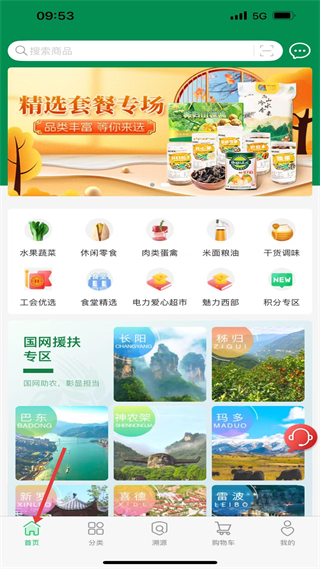 1、首頁設搜索欄,有精選套餐專場活動,分類入口涵蓋水果蔬菜、休閑零食等生活品類,還有國網援扶專區,展示多地助農區域。