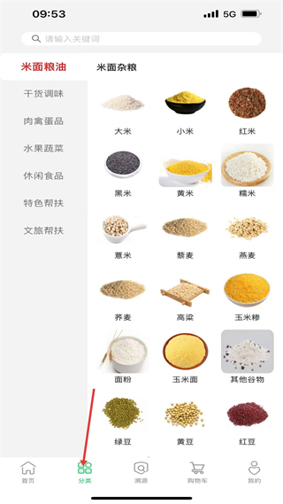 2、分類頁有米面糧油等分類,米面糧油類細分大米、小米等多種谷物雜糧,分類細致,便于用戶查找各類食材。