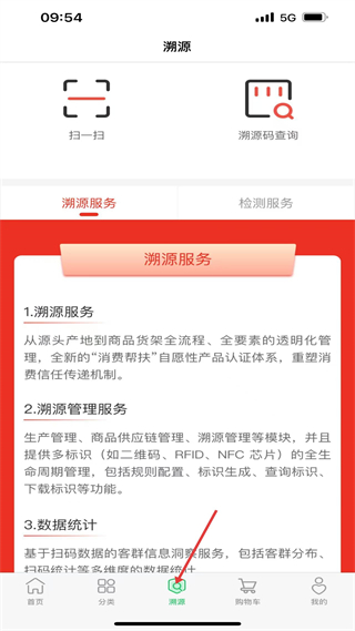 3、溯源頁有掃一掃、溯源碼查詢功能,介紹溯源服務,涵蓋從源頭到貨架全流程管理及數據統計服務,保障商品透明可查。