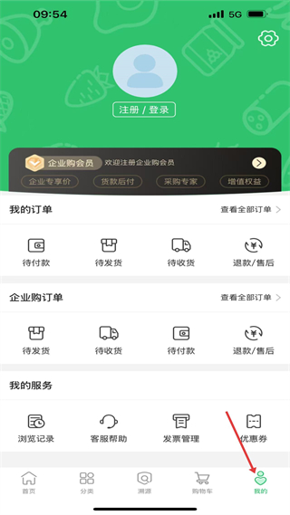4、我的頁有注冊登錄入口,可管理個人及企業購訂單,還有瀏覽記錄、客服幫助等服務入口,滿足用戶訂單及服務管理需求。