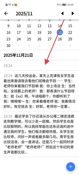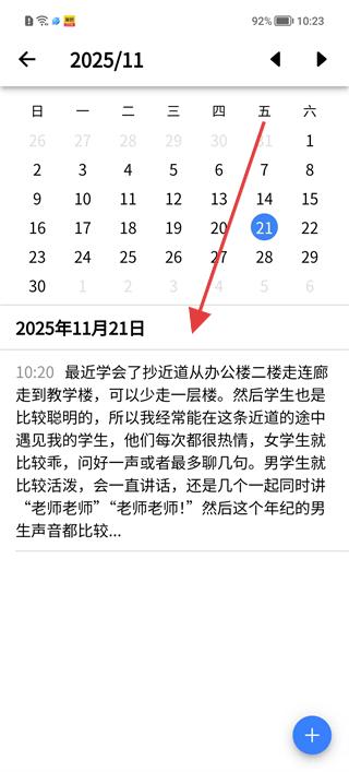 3、在日歷頁面選擇2025年11月21日,查看當天已發布的日記內容,可點擊對應條目查看詳情。