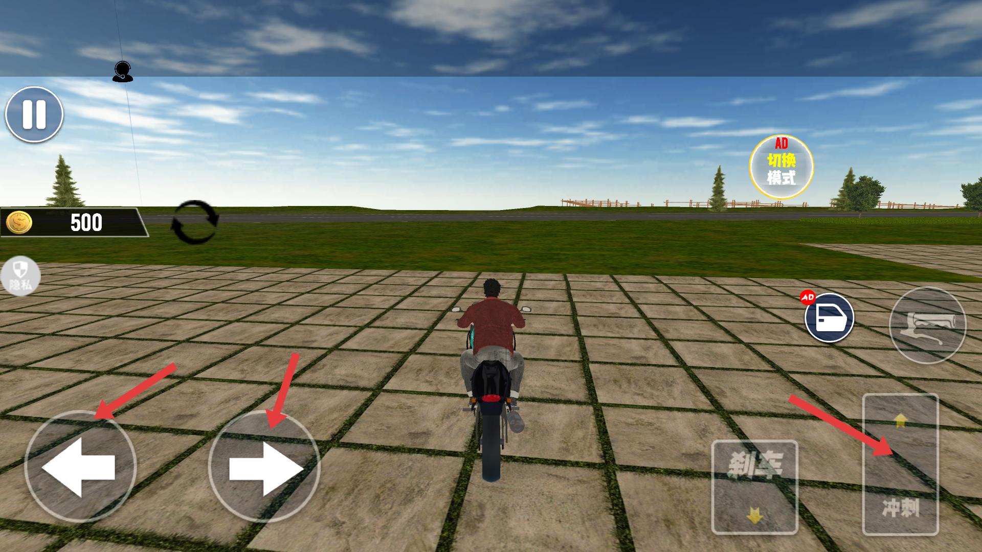 3、駕駛摩托車時,左側有左右方向按鈕控制轉向,右側有剎車、沖刺按鈕,點擊沖刺按鈕,可讓摩托車快速前進,提升速度。