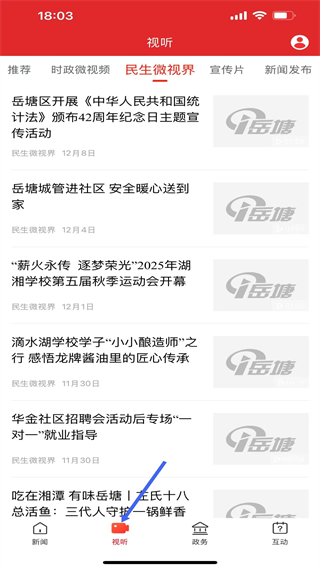 2、切換到視聽板塊,選擇民生微視界分類,可查看岳塘區的主題宣傳、社區服務、校園活動等視聽內容,了解本地民生相關動態。