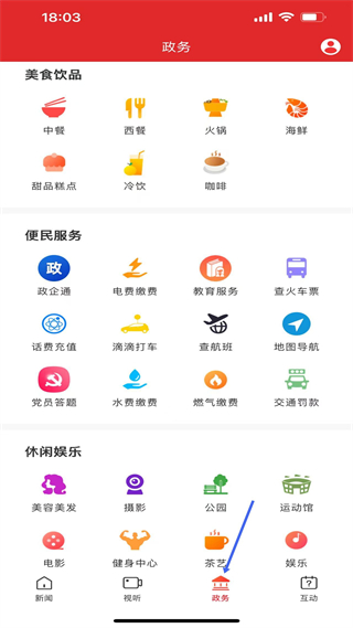 3、進入政務板塊,可使用美食飲品分類查找餐飲類型,也能通過便民服務板塊的電費繳費、教育服務等功能,獲取生活服務支持。