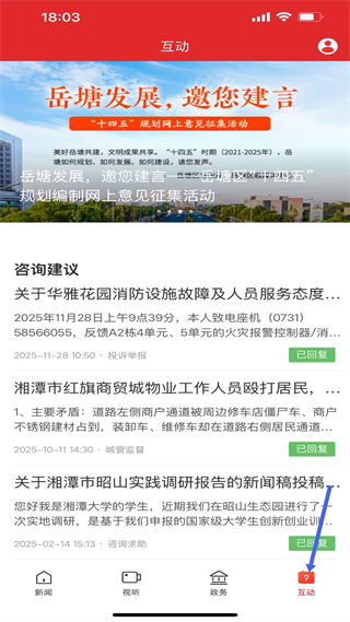 4、切換到互動板塊,可參與岳塘發展建言活動,也能查看咨詢建議的反饋內容,參與本地發展相關的互動與意見提交。