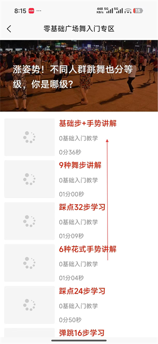 1、打開學跳廣場舞軟件,進入首頁后,點擊零基礎入門教學區域,進入零基礎廣場舞入門專區,查看相關教學內容列表。