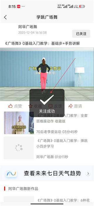 4、點擊關注TA后頁面顯示關注成功提示,后續可在該賬號下查看更多廣場舞教學視頻,學習不同的舞蹈內容。