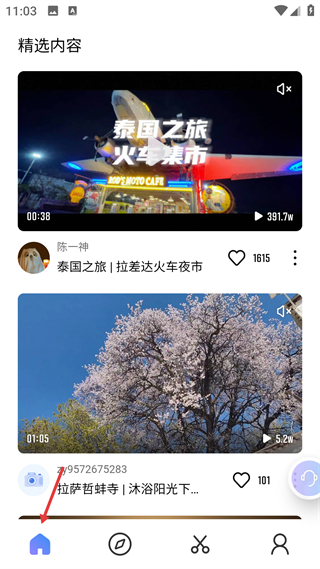 1、進入首頁精選內容頁,可瀏覽不同創作者的旅行短視頻,查看內容標題時長播放量及互動數據,獲取多樣旅行場景內容。