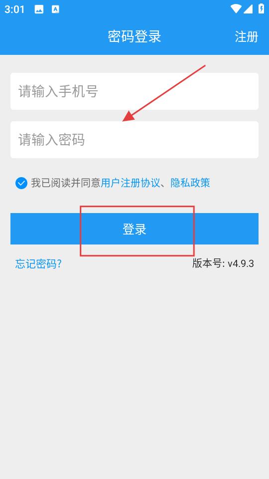 1、進入密碼登錄頁面,輸入手機號碼和密碼,勾選我已閱讀并同意用戶注冊協議、隱私政策,點擊登錄按鈕完成登錄操作。