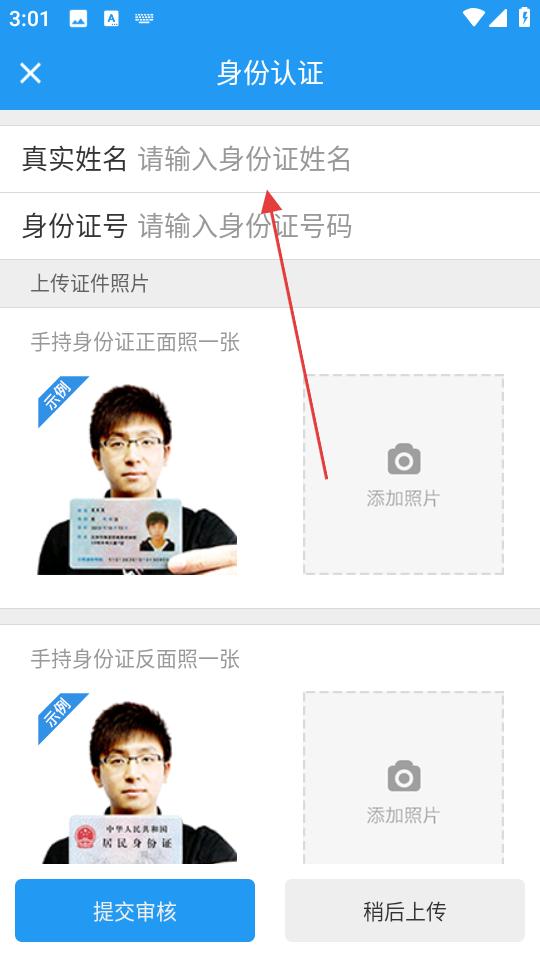 3、在身份認證頁面,依次填寫真實姓名、身份證號,按示例要求上傳手持身份證正面照、反面照,完成后點擊提交審核。