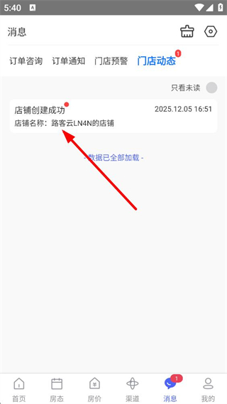 4、點擊底部消息按鈕進入對應頁面,可查看訂單咨詢、門店動態等通知,及時獲取店鋪創建、訂單變動等業務信息,是掌握運營動態的重要渠道。