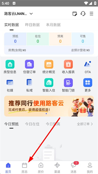 1、進入系統首頁可查看實時數據,包含預抵、在住等住宿狀態,還有房型信息、住宿訂單等功能入口,是民宿酒店類業態管理房源與訂單的基礎操作界面。
