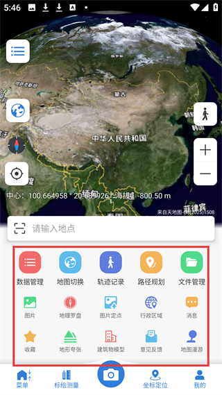 1、主界面呈現地球衛星地圖,有數據管理等功能入口,可進行圖片、地理羅盤等操作,支持坐標定位和標繪測量。