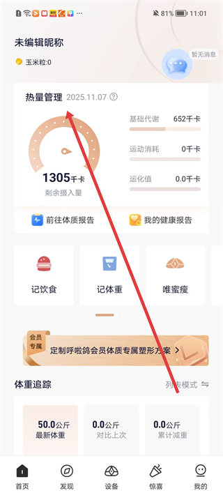 2、在個人頁面可查看熱量管理板塊了解基礎代謝、運動消耗、運化值等數據,還能查看剩余攝入量,同時可進行記飲食、記體重等操作,管理日常健康數據。