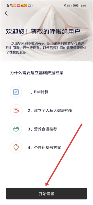 1、進入軟件后點擊開始設置,進行基礎數據檔案建立,可實現BMI計算、建立個人私人健康檔案、以便后續享受個性化健康管理服務。