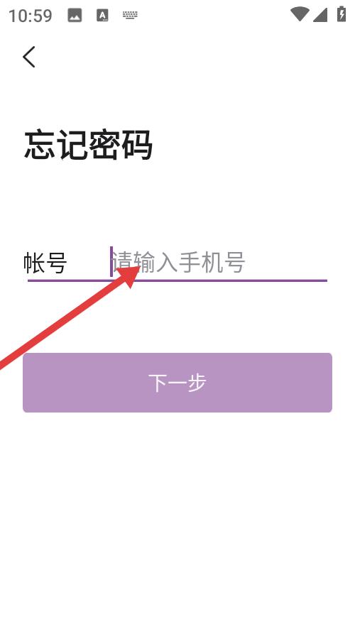 3、忘記密碼頁面設計簡潔賬號欄提示輸入手機號,紫色下一步按鈕待填啟用,幫助用戶在遺忘密碼時,通過手機號驗證步驟,逐步找回賬號登錄權限。