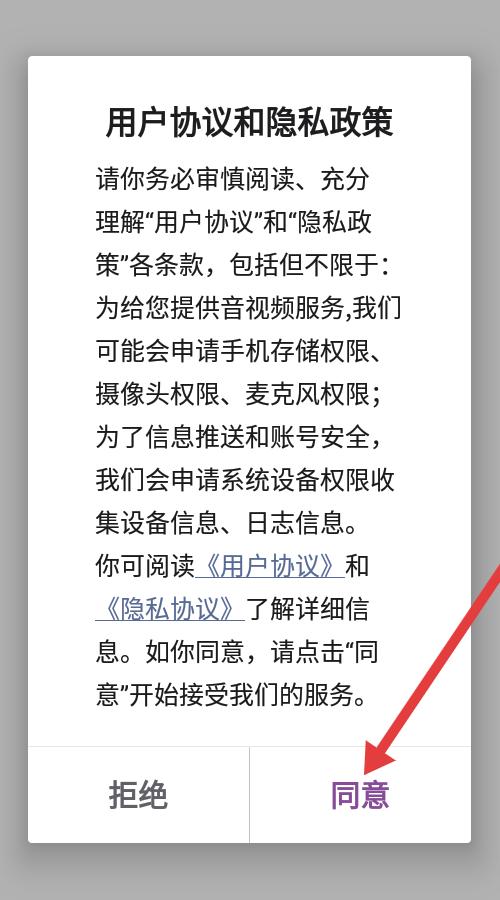 1、用戶協議彈窗內容詳實闡釋音視頻等服務的權限申請,提及信息推送與賬號安全的設備信息收集,提供協議查閱入口底部同意按鈕點擊進入。