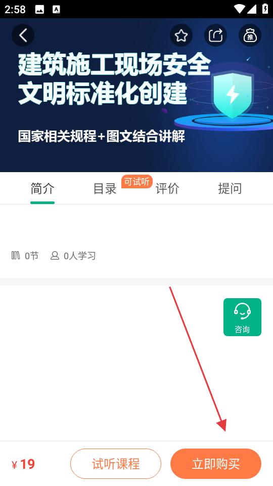 3、課程詳情頁,可點擊試聽課程體驗內容,若確定購買,點擊立即購買按鈕,完成課程購買的操作流程。