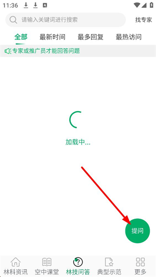 3、林技問答界面,可看到搜索欄和問題排序選項,點擊右下角提問按鈕可發布林業相關問題,由專家或推廣員進行回答。