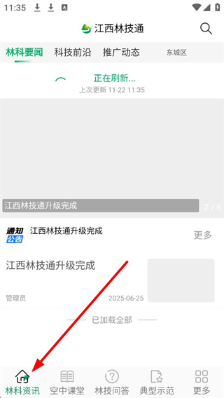1、打開江西林技通APP,進入林科資訊界面,可看到林科要聞、科技前沿等欄目,展示林業相關資訊,點擊底部更多按鈕進入更多功能界面。