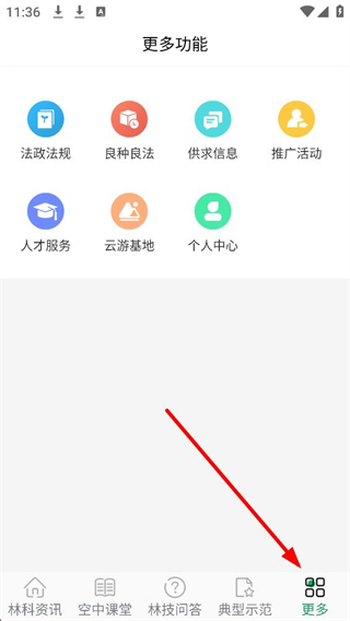 2、更多功能界面,可看到法政法規、良種良法等功能入口,點擊林技問答按鈕進入林技問答界面。