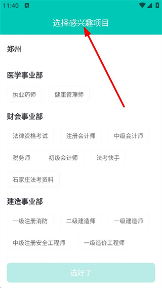 3、登錄后進入選擇感興趣項目頁面,可從醫學財會建造等事業部中挑選對應考試項目,選好后點擊選好了,即可進入個性化學習界面。