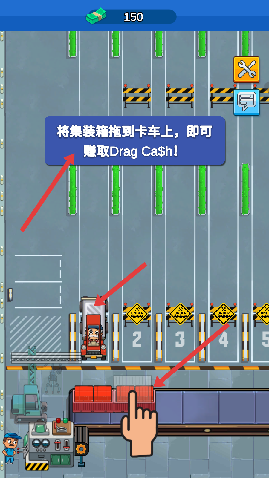 1、進入游戲,將集裝箱拖到卡車上,就能賺取鈔票,通過這種方式積累初始資金,開啟運輸經營。