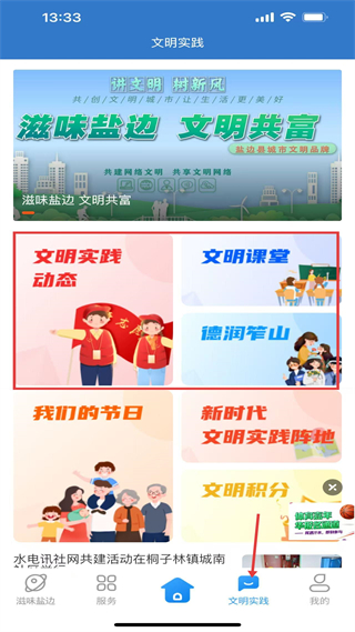 1、進入鹽邊融媒首頁,頁面有各類資訊與功能按鈕,點擊底部文明實踐選項,進入對應的功能頁面開啟探索。