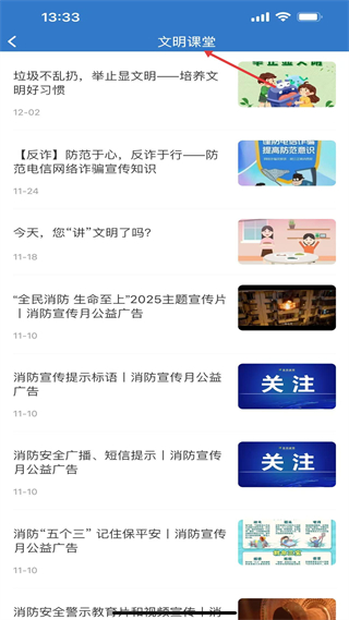 3、在文明課堂列表頁面,看到多篇文明相關文章,選擇垃圾不亂扔的文章,準備查看其詳細內容。