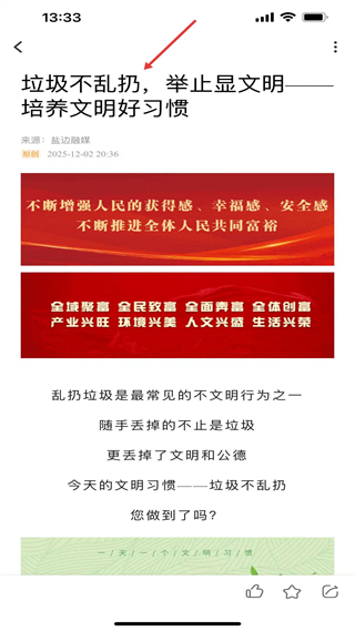 4、進入垃圾不亂扔的文章詳情頁,查看內容了解文明習慣,還能進行點贊等互動操作,學習文明相關知識。