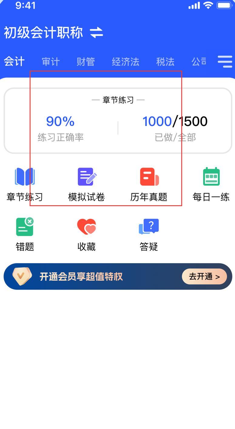 1、呈現初級會計職稱學習數據,含正確率做題量,提供章節練習模擬試卷等功能入口。