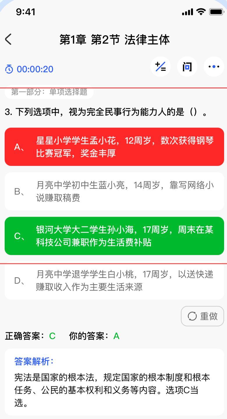 3、顯示具體法律主體題目,含選項作答記錄,提供正確答案解析,支持重做。