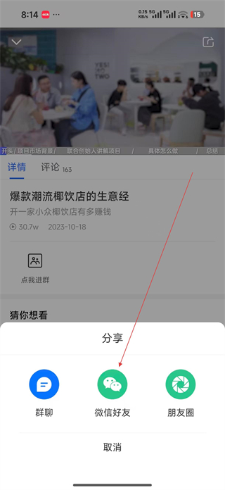 4、在分享選項界面中選擇微信好友渠道,可將該項目資訊分享給對應好友,完成分享后可返回繼續瀏覽其他資訊。