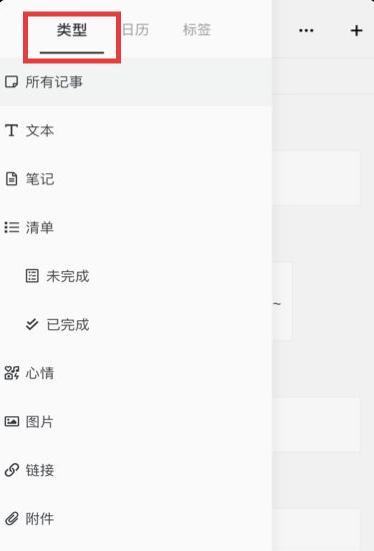 3、點擊類型,在列表中選擇文本、清單等類型,篩選出對應類型的筆記。