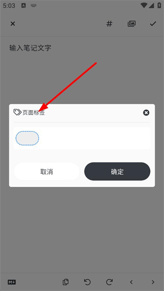 3、筆記編輯中可添加頁面標簽,輸入標簽內容后點擊確定即可完成添加,便于對筆記進行分類管理,也可點擊取消放棄標簽添加操作。