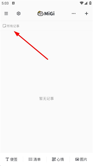 1、進入MiGi記事可看到所有記事列表,界面簡潔,若暫無記事會顯示對應提示,還可切換便簽、清單、心情、圖片等不同記事類型來記錄內容。