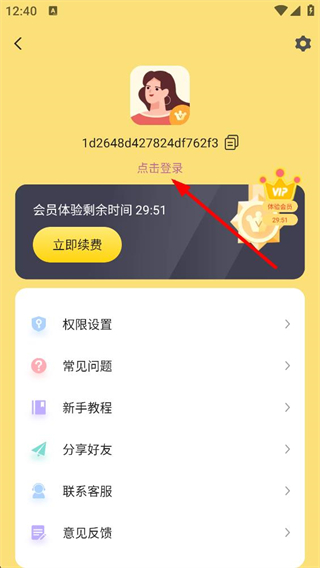 2、進入該界面后,看到會員體驗剩余時間與權限設置等功能,點擊點擊登錄選項,彈出新人登錄的操作窗口。