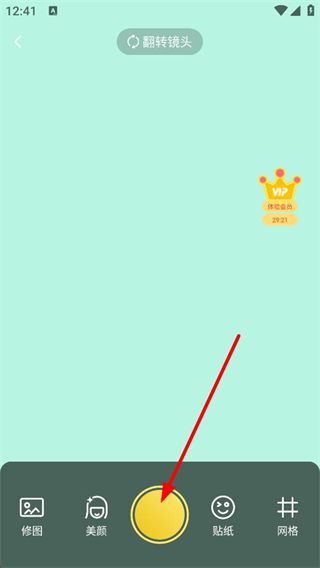 4、完成登錄后進入相機界面,看到翻轉鏡頭選項,底部設修圖美顏等功能按鈕,點擊中間按鈕,可進行拍攝相關操作。
