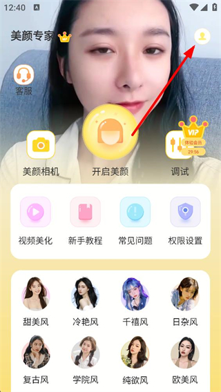 1、進入美顏專家主界面,可見客服、美顏相機等功能入口,還有甜美風冷艷風等風格選項,點擊右上角頭像,進入對應功能界面。