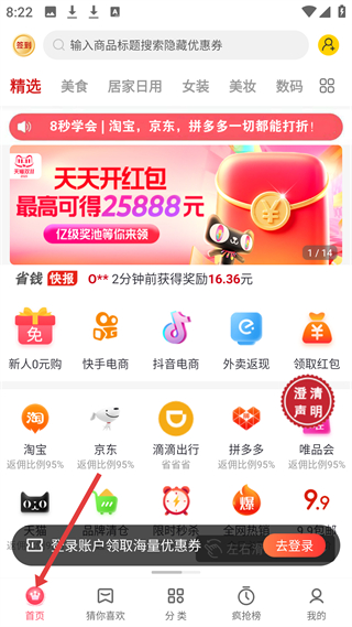 1、首頁,有搜索欄、簽到入口,展示精選等分類,還有天天開紅包活動、新人0元購等功能入口及淘寶、京東等平臺入口。