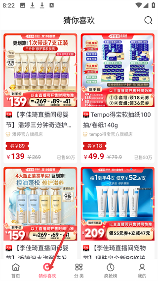 2、猜你喜歡板塊,展示潘婷護發產品、Tempo得寶紙巾等商品,標注價格、優惠及銷量,基于用戶喜好推薦商品。