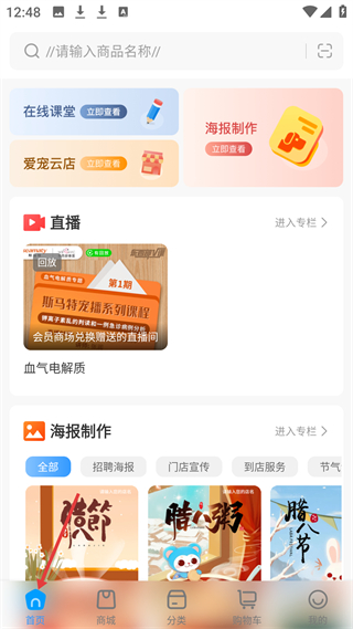 1、首頁,有在線課堂、海報制作等功能入口,還有直播和海報制作板塊,提供寵物相關知識和工具服務。