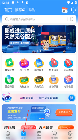 2、商城頁,有搜索欄和愛寵耗材、寵物主糧等分類,展示寵物商品,還有AI智能采購功能,方便寵物用品采購。