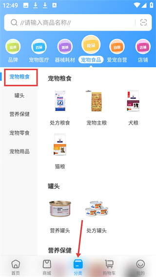 3、分類頁寵物食品板塊,有寵物糧食、罐頭等分類,細分處方糧食、寵物主糧等,覆蓋寵物食品全品類。