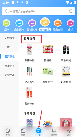 4、分類頁營養保健板塊,有骨骼保健、卵磷脂等分類,還有化毛系列、腸胃呵護等,滿足寵物營養保健需求。