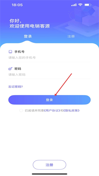 1、登錄頁,用戶輸入手機號、密碼,勾選協議后可登錄,也可注冊新賬號,方便進入APP獲客。