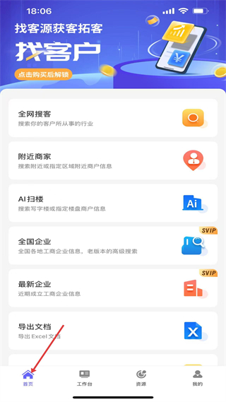 2、首頁界面,有全網搜客、附近商家等多種獲客方式,還可查詢企業信息、導出文檔,滿足不同找客源需求。