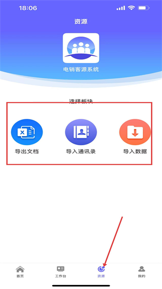 3、資源界面,可進行導出文檔、導入通訊錄、導入數據操作,助力用戶管理客源數據,提升獲客效率。