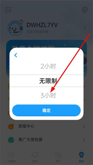 3、點擊限制時間后,會彈出選擇界面,里面有2小時無限制3小時三個時長選項,選擇對應的時長后,點擊確定按鈕,即可完成該功能的時長設置操作。